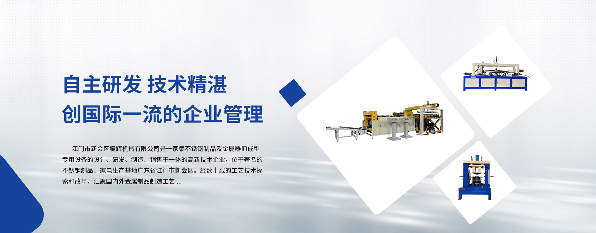 江門市新會區(qū)騰輝機械有限公司是一家集不銹鋼制品及金屬器皿成型專用設(shè)備的設(shè)計、研發(fā)、制造、銷售于一體的高新技術(shù)企業(yè),位于著名的不銹鋼制品、家電生產(chǎn)基地廣東省江門市新會區(qū)。經(jīng)數(shù)十載的工藝技術(shù)探索和改革,匯聚國內(nèi)外金屬制品制造工藝。